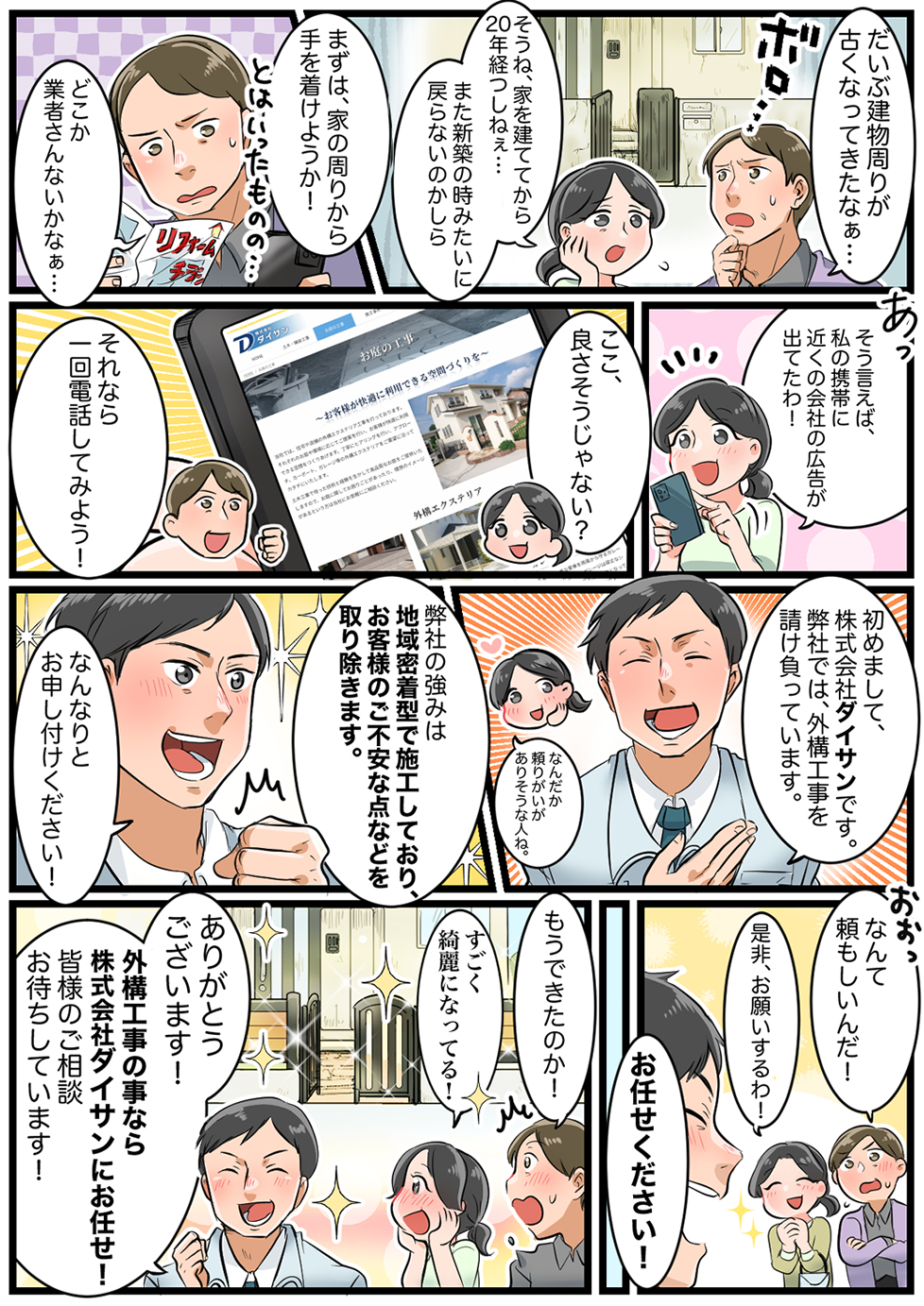施工後に弊社の施工による問題が生じた場合は保証期間内であれば無償補修対応いたします。また、メンテナンスの仕方など、分からないことはアドバイスいたします。